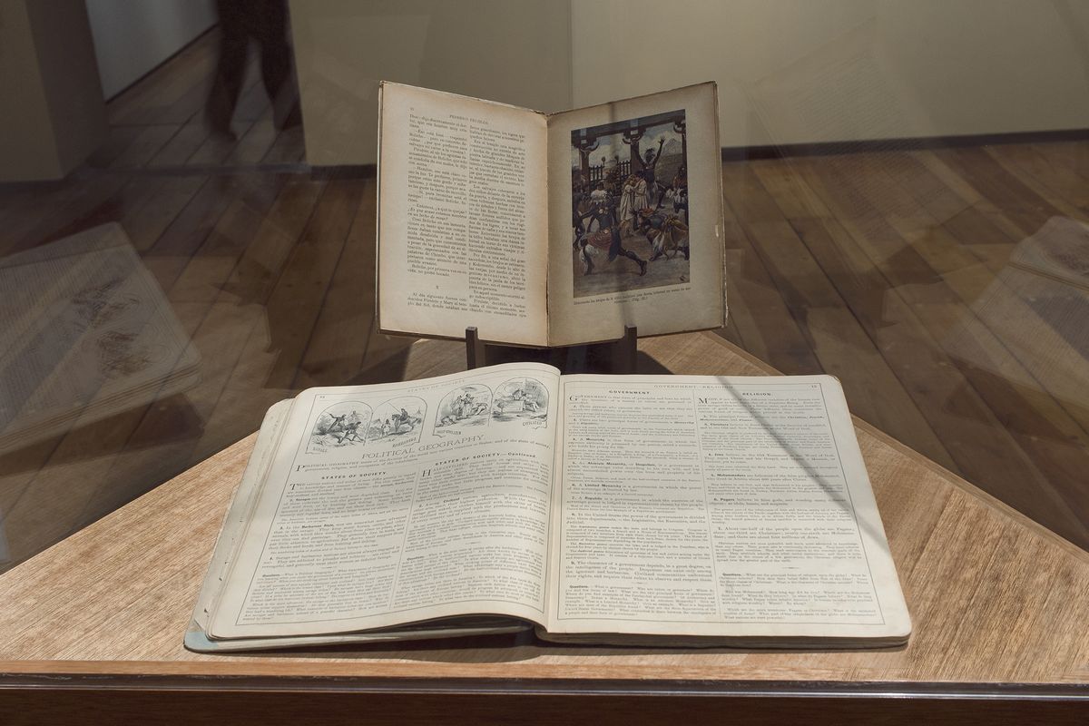 Federico Trujillo, Pirulete en el país de los antropófagos, ca. 1922, Libro y David M. Warren, Warren’s Common School of Geography, 1887, Libro, Colección César Carrillo Trueba (Facultad de Ciencias de la UNAM).